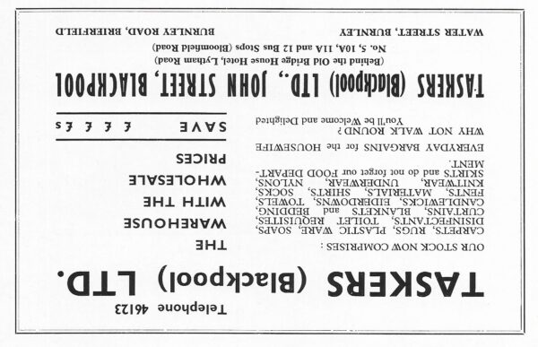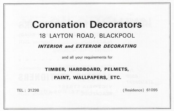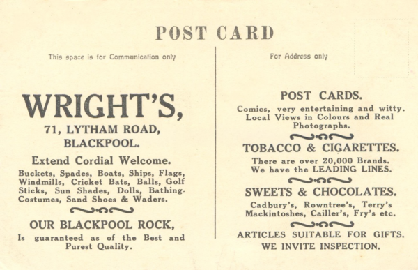 Advertisement postcard for Wright’s at 71 Lytham Road. They seemed to sell everything the holiday maker wanted !