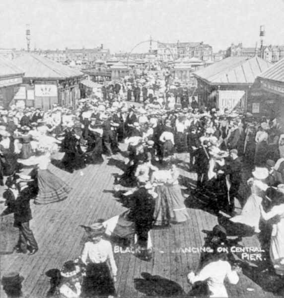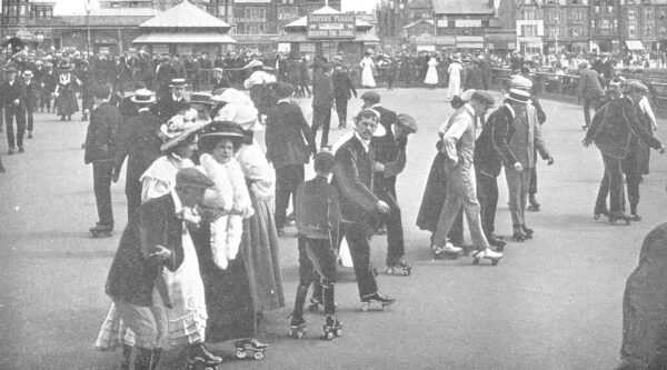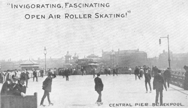 Roller Skating on the pier was a new craze. On the promenade in the background is ‘Tussauds Exhibition’