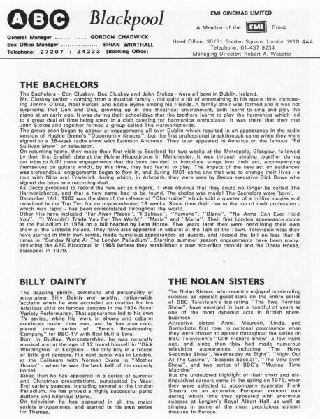 The Bachelors, Billy Dainty, The Nolan Sisters, Joe Church, The Mosaics and Dick Franco (addendum