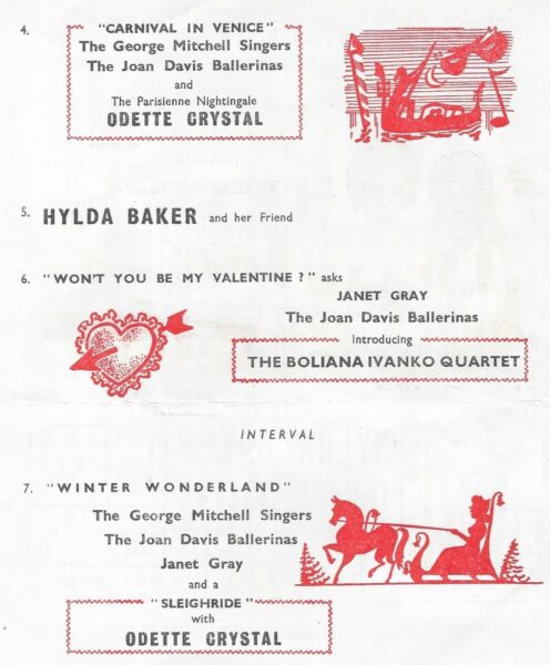Jack Douglas, Joe Baker, Gillian Moran, Roy Castle, Five Dallas Boys, Marion Ryan, and Peter Haigh