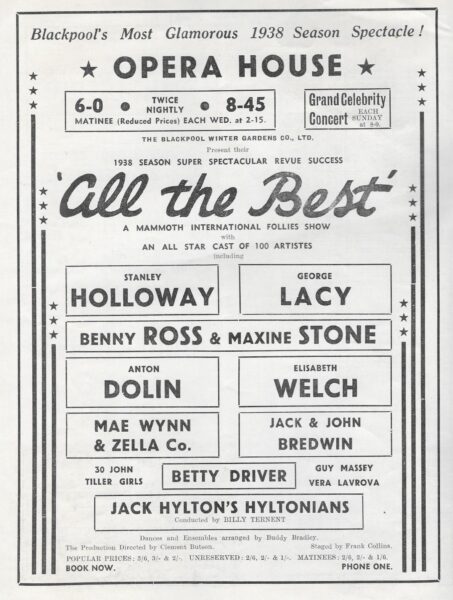 George Formby, Beryl Formby, Edna Squire –Brown, Ken Davidson and Hugh Forgie, Frank Paris, Peter Marwoode and Beatrix Richards, The Five Herons, Eric and Eric, The Six Wallabies, Manley and Austin, Ernie Gerrard and ‘The Forty Glamorous Beauties’