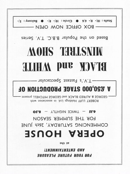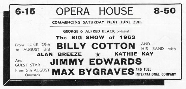 29th June to 3rd Aug. – Billy Cotton Band, Susan Lane, The King Brothers, Harry Bailey, Francis Brunn, The Bal Carron Trio, Derek Taverner Singers and Jimmy Edwards.