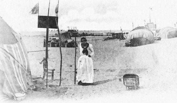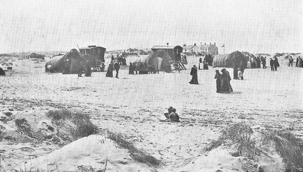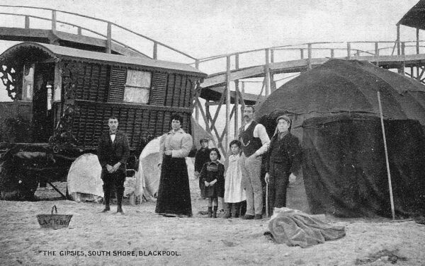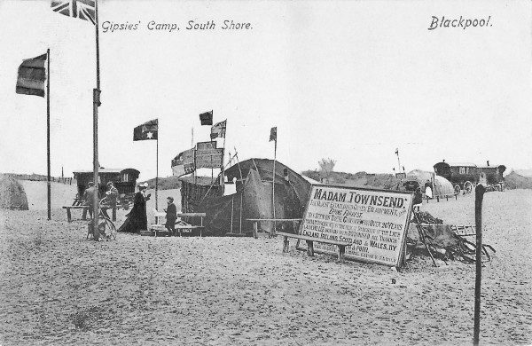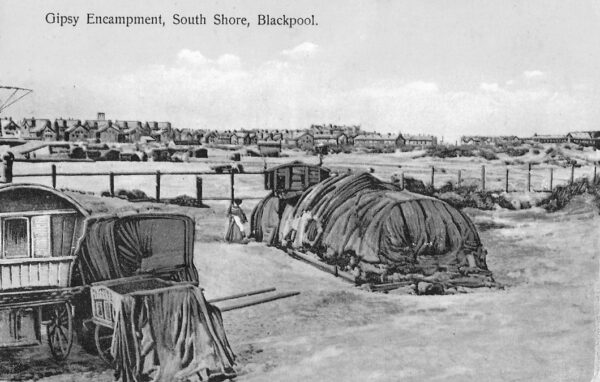 This card shows the gypsy camp, a combination of caravans and tents made of wattle hurdles covered with blankets.