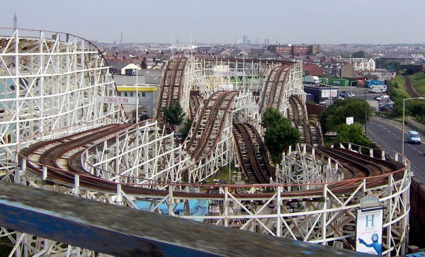 View of ‘Becher’s Brook’ from the top of the Grand National roller coaster, looking at Bond Street to the left