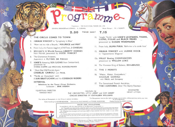 Charlie Cairoli with Paul, The Oliveras, Knie’s Norwegian horses, Duncan’s Collies, Jacky Lupescu, Wenzel Kossmayer, Vojtech Trubka, Tosca de Lac, Rogge Sisters, Ghezzi Brothers, Edith Crocker with her Teddy bears, Rose Gold, Annette’s Circusettes, Little Jimmy, Jimmy Scott